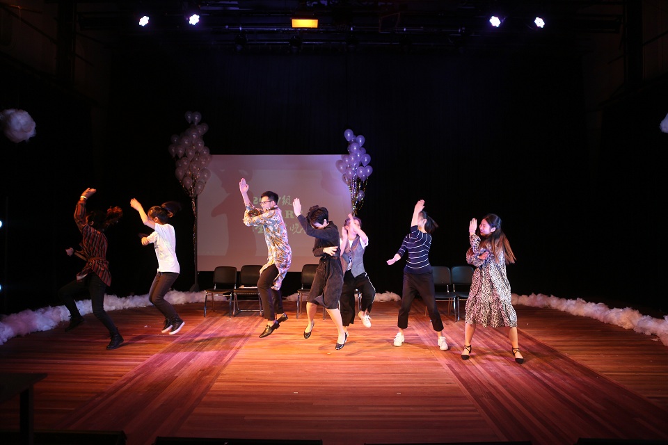 小品《思凡》是本次晚会中人数最多的一个节目,17级艺术管理班同学全体出动,同学们在台上又扭又跳,自己都被自己嗨翻了,展现了青春活力的上戏人面貌。最后收尾用了《社会摇》,大家开始群魔乱舞,台下同学也伸出手舞动起来。