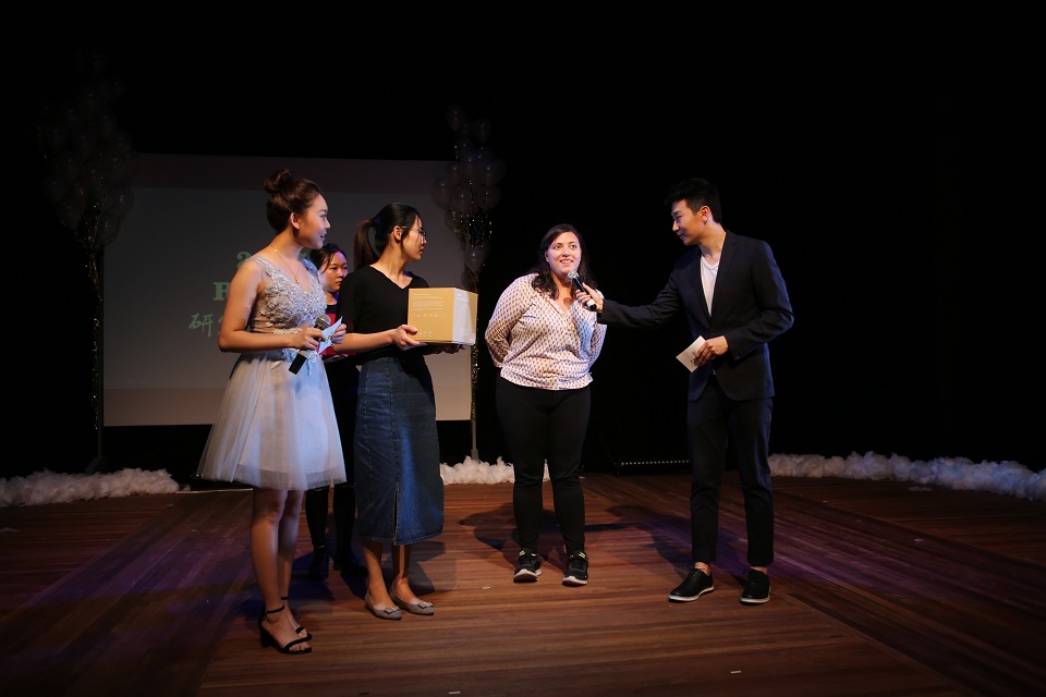 抽奖活动是全场参与度最高的环节,第一轮抽取三个三等奖,第二轮抽取两个二等奖,第三轮抽取一个一等奖。二等奖的奖品是体脂称,两名被抽中的观众身材都很苗条,主持人调侃说:“看来是给错人了,两位都不需要!”更有意思的是一等奖的抽奖活动,被一位来自墨西哥的同学抱回去。这位女生非常开心,用不太流利的中文表达着内心的喜悦与对上戏的热爱。