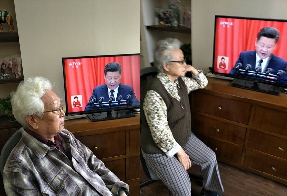 图为我校离休干部张振民、江文逑夫妻俩在养老公寓一起观看十九大实况直播