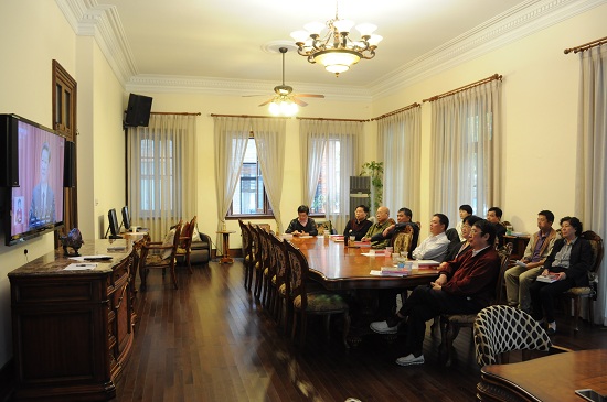 图为我校退休教授、灯光专家柳得安(左一)参加“中国演艺设备技术协会第五(上海)分会”班子人员、专家委员会主任集体观看十九大实况直播