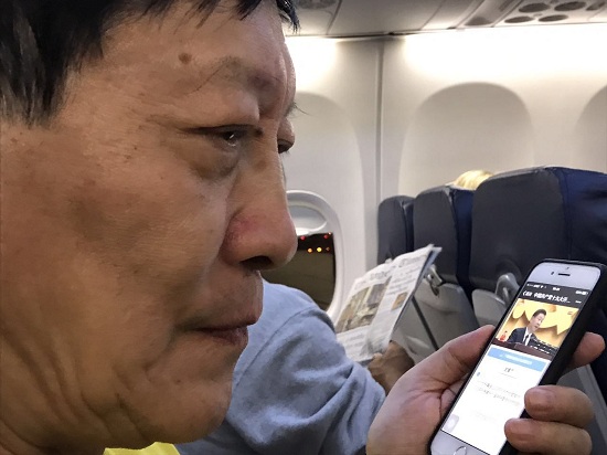 图为我校原院长荣广润教授在飞机上通过手机观看十九大实况直播