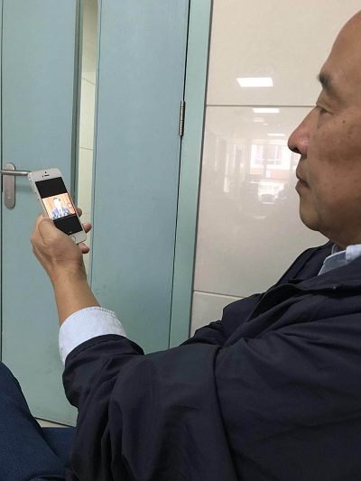图为我校原基建处处长范和生在中山医院候诊期间通过手机观看十九大实况直播