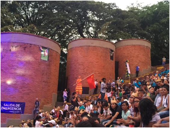 20号晚上,在卡利市中心的文化公园的露天剧场内,举行了庄重而热烈的戏剧节开幕式。也许是因为有中国代表团出席的缘故,现场出现了一面不断挥动着的五星红旗。这使我校巡演团的师生们倍感亲切!我们为祖国、为母校争得了荣誉,大家为此而倍感自豪!
