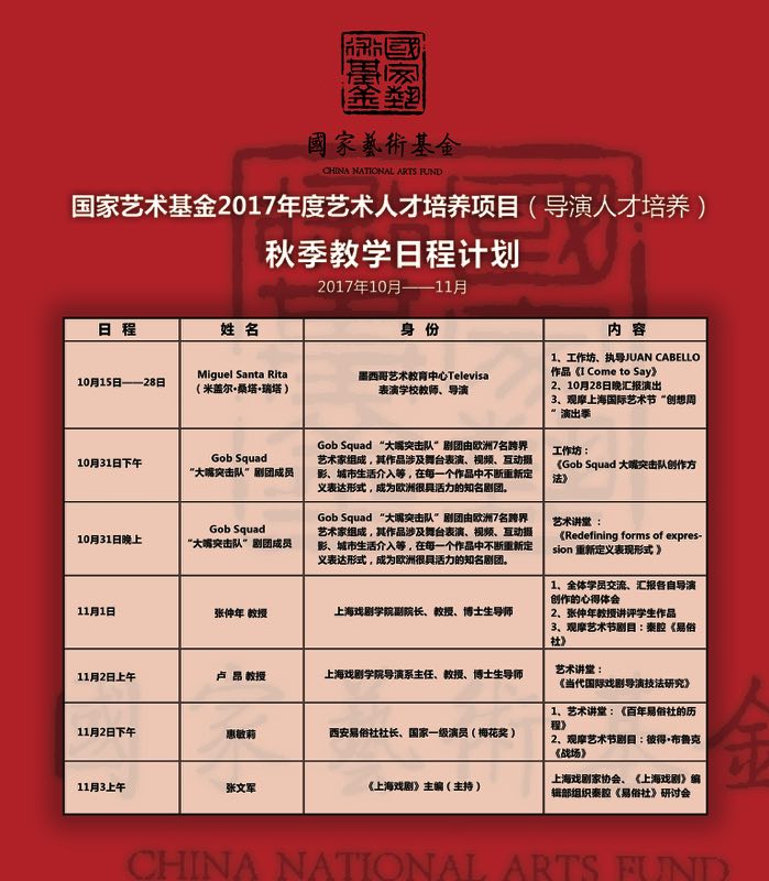 国家艺术基金2017年度艺术人才培养项目——“导演人才培养”秋季课程已于十月金秋在上海戏剧学院开启。此次课程受国家艺术基金资助,是国家级导演人才培养项目,为期3周,将于11月3日落下帷幕。导演人才培养班为学员设置了系统而丰富的课程内容,从理论到实践,以不同的形式,从不同的角度全面提升学员的戏剧导演创作能力。