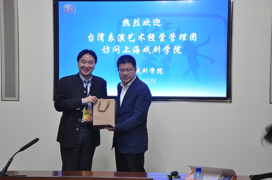 应文化部邀请,台湾表演艺术经营管理团一行20人于2017年10月31日来上海戏剧学院做交流访问,该访问团是由中华文化联谊会与台湾广艺基金会共同举办的“艺游两岸”两岸表演艺术交流活动。来访成员由台湾主要表演艺术场所、表演艺术团体经营者、制作人等组成。上海戏剧学院是台湾代表团在上海活动的行程之一,台湾来访人员与上海戏剧学院有关人员就两岸在艺术管理学生的培养、学生剧目实践,演出策展教学、剧本项目孵化等方面进行了交流。
