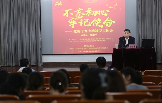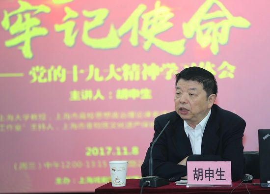 2017年11月8日中午,戏校学校全体在职党员、入党积极分子、部分退休党员及戏曲学院、电视艺术学院党员济济一堂,在莲花路图书馆报告厅共同聆听胡申生教授的“不忘初心、牢记使命——党的十九大精神学习体会”报告。胡教授是上海大学教授、上海市高校思想政治理论课“胡申生名师工作室”主持人、上海市非物质文化遗产保护专家组成员。