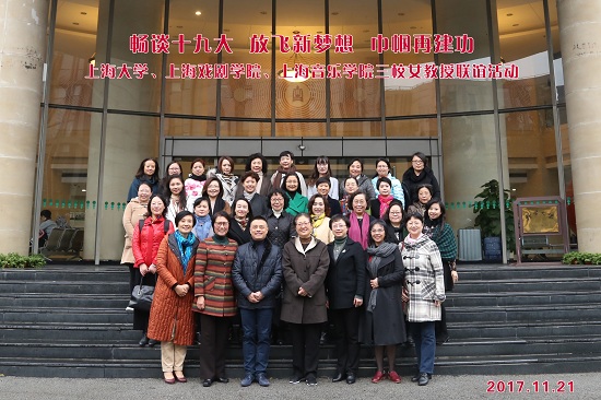 2017年11月21日,上海大学、上海戏剧学院、上海音乐学院三校女教授在上海音乐学院开展了“畅谈十九大、放飞新梦想,巾帼再建功”的联谊活动。三个学校在各个专业领域、教学岗位上为上海作出贡献的近40位女教授参与了活动。上海市教育工会常务副主席、妇工委王向群及市教育工会相关同志参加了会议。我校党委副书记胡敏,副院长、工会主席张伟令,总会计师张佳春及工会常务副主席王苏带领我校女教授参加了此次活动。