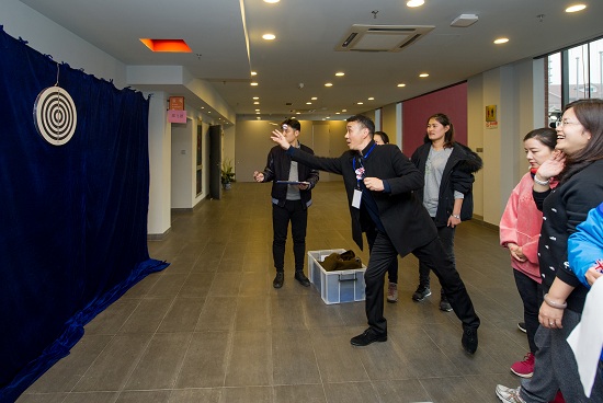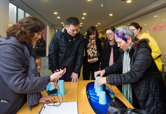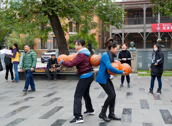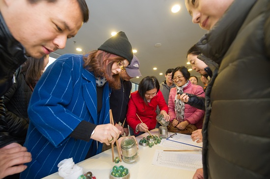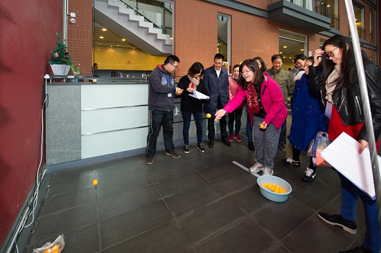 运动会开始后,跃跃欲试的运动员们奔赴各自的比赛场地。说是比赛,其实是一场趣味的友谊运动会。本着健康运动、有趣生动的原则,运动会项目也结合了传统和创新。有掼结子、滚铁环、抽汉奸、踢毽子等传统的老上海弄堂游戏,也有飞叠杯、掷飞镖、定点投篮、投乒乓球这样的年轻活力项目。在团队游戏现场,更是笑声不断,七球大挪移需要两位老师配合默契,不仅要拿球,还要背对背夹球前进,往往到中途总是掉落一二,顾头不顾尾,惹得周围观看的老师们一阵欢笑。在仰卧起坐接球的团队项目中,五人合作,通过仰卧起坐,将球从第一个人传到第二个人,直至第五个人接球触地。看似简单,实则有难度,既要配合默契,又要有很好的腰腹力量。很多老师长久不做腹部运动,久坐办公室,躺下去就上不来。大家齐声鼓励:“加油!”“起来啊!”“我拉你一把”起身后的老师感叹:“我以前能做好多的仰卧起坐,怎么现在一个就起不来了呢,腰是不行啦!”不服老的精神让他们感到意犹未尽!