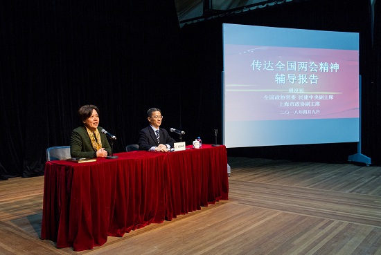 4月9日上午,我校在新空间剧场召开中心组(扩大)理论学习专题会议,邀请了全国政协常委、民建中央副主席、上海市政协副主席周汉民教授就今年全国两会精神进行了专题辅导。会上,周汉民教授做了题为《贯彻全国两会精神,进一步开拓改革开放新局面》专题报告。校领导、中层干部、师生党员代表、统战人士代表、离退休教职工代表等参加,会议由党委副书记胡敏主持。