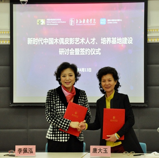 发言过后,由唐大玉秘书长长代表中国木偶皮影艺术学会与上海戏剧学院签订了中国木偶皮影艺术人才培养基地续约协议,双方合影留念。