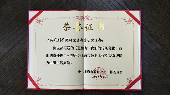 我校研究生部学生党支部提报的组织生活案例:思想者:我们的传统文化,我们的责任担当,在组织部的指导和推荐下,参加了市教卫工作党委组织开展的优秀组织生活案例、优秀主题党日案例、基层党建特色项目征集评选活动。经过遴选和推荐,最终被评为上海市教卫工作党委系统“优秀组织生活案例”。