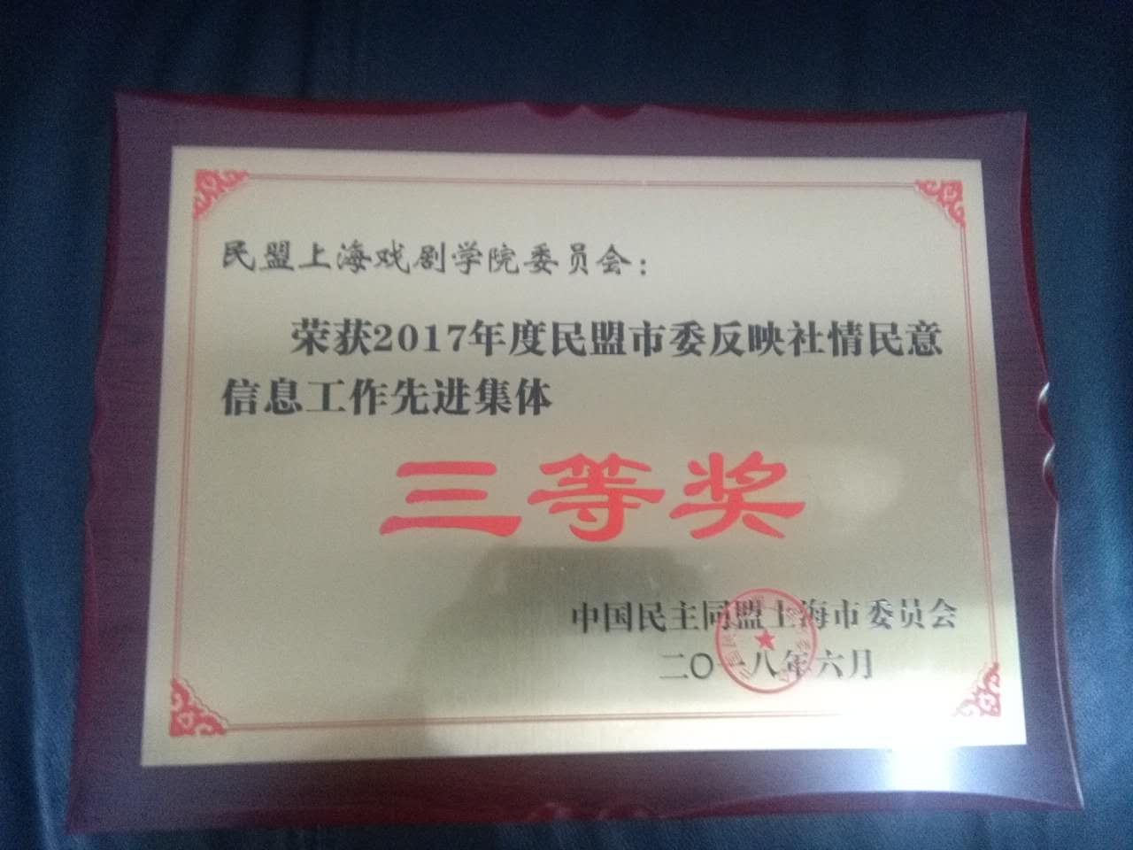 6月20日下午,民盟上海市委2018年参政议政工作会议在上海市民主党派大厦举行。上海市副市长、民盟中央副主席、民盟上海市委主委陈群出席会议并作重要讲话。在会议上,民盟上海戏剧学院委员会荣获民盟上海市委2017年度社情民意信息工作先进集体三等奖,民盟中央宣传委员会副主任、民盟上海市委常委、民盟上海戏剧学院委员会主委厉震林荣获民盟上海市委2017年度社情民意信息工作先进个人,他领衔的参政议政调研课题《关于长三角影视产业一体化的若干建议》被立项为2018年度民盟上海市委参政议政重点课题。