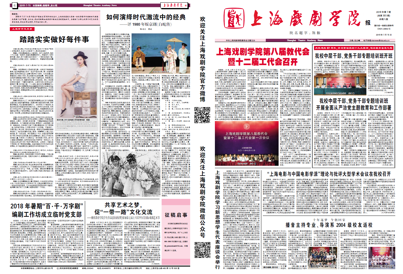 《上海戏剧学院报》2018年第7期(总第303期)已于2018年7月15日出版,本期彩版,共八版。重点内容有:《上海戏剧学院第八届教代会暨十二届工代会召开》《我校中层干部、党务干部专题培训班开班》《上海戏剧学院学习新思想学生代表座谈会举行》《“上海电影与中国电影学派”理论与批评大型学术会议在我校召开》等。本期还刊登了《2017年度学校行政工作报告》《上海戏剧学院第十一届工会委员会工作报告》《以改革促发展 以开放求卓越 为把学校加快建设成为国内领先世界一流高等艺术院校而努力奋斗—— 在中国共产党上海戏剧学院第二次代表大会上的报告》《看齐忠诚履职 监督执纪问责 不断推动学校全面从严治党向纵深发展——中国共产党上海戏剧学院第四届纪律检查委员会向中国共产党上海戏剧学院第二次代表大会的工作报告》。敬请关注,也可点击下载阅读。(文、图、编辑:榕树)