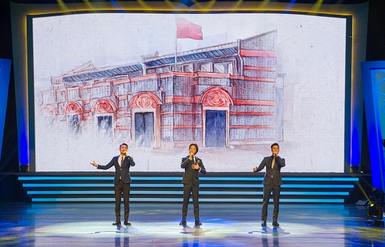 我校教师余笛(力量之声组合之一,图中)表演男生组合重唱《新的天地》