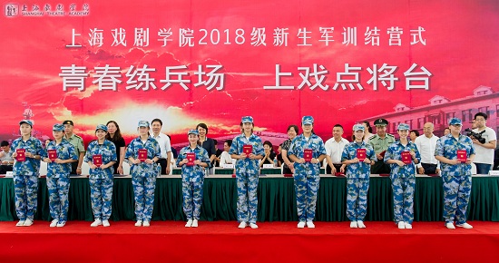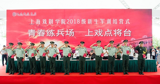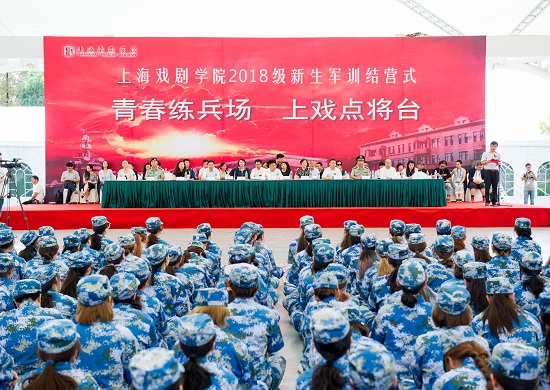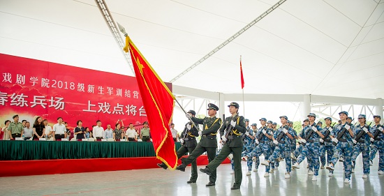 结营式在奏唱国歌的仪式中正式开始。党委副书记、院长黄昌勇在东方绿舟副主任、上海市国防教育中心主任吉峰陪同下,检阅了18级新生受训连队。在分列式行进过程中,由曾服役中国人民解放军三军仪仗队的3名教官带领24名护旗手组成的军旗护卫组,走在队伍前列,新生代表高高举起上海戏剧学院校旗紧随其后,10个受阅方阵依次经过主席台,接受校领导和院系领导老师们的检阅。所有方阵队列整齐、精神抖擞,展现了上戏学子奋发向上、团结一致的良好风貌。