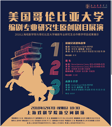 此次演出包括了《格林童话恐怖故事选》(The Terrifying Tales of the Brothers Grimm)、《乘车》(Take The Car)和《未满十八岁》(Affordable Rates and Color TV)三部作品,分别是哥大编剧专业研究生安迪.博伊德和诺拉.凯西所作,并在中方导师陆军教授与黄溪副教授的指导下完成修改搬上舞台。由上戏编剧学博士后鲁小艳、博士生刘才华和硕士生赵煜君负责剧本翻译。哥大学生的作品一如既往,强调深刻的思想内涵与独特的风格表达。《格林童话恐怖故事选》讲述的是一群渴望走出1968年苏联侵占阴霾的捷克戏剧人,他们要排一出新戏却不得不面对审查官的检查,双方你来我往不停地角逐、妥协和应对,“故事为谁而讲”成为所有人争执的核心。《乘车》的故事发生在20世纪80年代和2000年的洛杉矶,作者选取毒品来作为“垮掉一代”的象征:一代又一代的年轻人沉沦于毒瘾、肉欲的迷乱之中,所造成的结果便是亲子疏离、家庭内部危机重重。生而为人我们到底该追求什么,该保护什么——这是作者抛给每个观众的问题。而《未满十八岁》诉说的故事是:一个突然失去母亲的女孩子,必须决定是留在她成长的故乡,还是与比她年长得多的男朋友一起远走他乡。在选择背后所包含的对青少年时代生命经历的留念和对未来不确定性的希望之间的挣扎,是大家初为成人时都不得不面对的困惑,相信会引起每个观众的共鸣。
