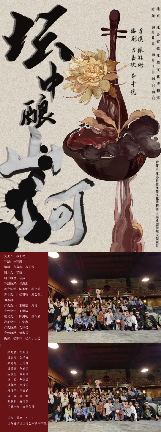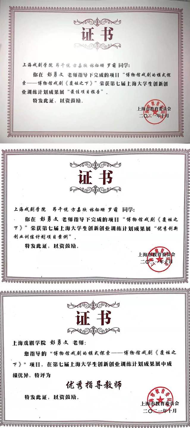 近日,由上海戏剧学院戏文系教授彭勇文老师指导,18级戏剧教育专业昂千悦同学策划主创,全校多个专业的学生共同创作的博物馆戏剧《坛中酿山河》(原名《覆坛之下》)荣获第七届上海大学生创新创业训练计划成果展“最佳项目报告”“优秀创新创业训练计划项目案例”奖;该项目指导教师,彭勇文老师获“优秀指导教师”称号。