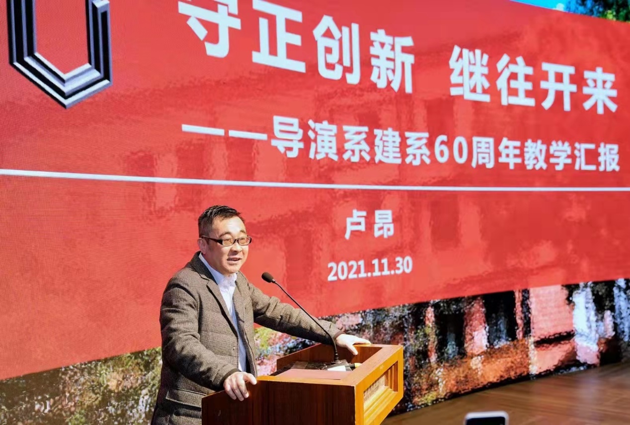随后,导演系负责人卢昂进行了汇报发言,全面总结了导演系60年来尤其是新世纪以来的教学工作成绩经验,深入分析新文科建设背景下导演系面临的形势任务,系统阐释了导演系发展的目标与定位、方法与策略,也勇于直面的发展中问题与思考。他明确提出坚持社会主义办学方向、坚持立德树人根本任务、坚持“扎根本土、放眼世界、融贯中西、勇于创新”的艺术理念、坚持“以学生为本,为其提供最完好的艺术创作实践基地;放眼全世界,聚集全球最优良的师资力量于一体”的教学理念及“国际化与民族化的创造性融合”的教学特色。未来导演系将秉承中华美学精神,融合世界戏剧优长,创建具有民族特色的“中国表导演学派”,培养有情怀、有担当、技艺全面、勇于创新的德艺双馨“至善至美”的复合型导演艺术人才。