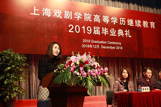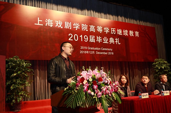 毕业典礼在雄壮的国歌声中开始,首先由16级广播电视编导(专升本)杜伟同学作为学生代表发言。她向大家讲述了她与继续教育的不解之缘,原本有着体面的工作和收入的她,本着对艺术的追求和热爱,复旦法学硕士毕业之后又加入继续教育。她十分感谢在上戏学习的三年时光,感谢老师对自己的培养和教育。之后,及鹏飞老师作为教师代表上台讲话。及老师从改革开放40周年的伟大历史成就中总结了中国电影发展的5个标志电影,同时告诫学生要做人坚持清流,做事坚持创新。随后,继教院常务副院长马麟鸿宣布毕业生名单。