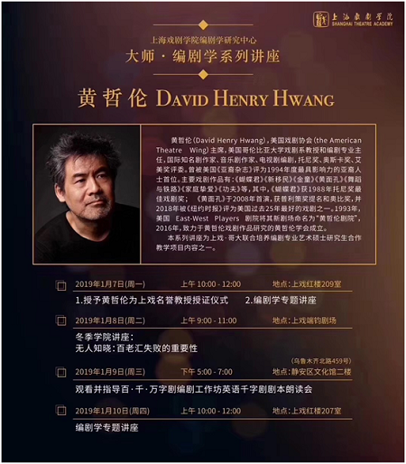 2019年新年伊始,美国当代最著名的华裔剧作家、哥伦比亚大学戏剧系教授和编剧学专业主任黄哲伦先生应上海戏剧学院编剧学研究中心之邀来到上戏,举行为期一周的编剧学教学与学术交流活动。7日上午,上海戏剧学院荣聘黄哲伦为名誉教授仪式在红楼209教室举行,上海戏剧学院党委书记楼巍教授、副院长刘庆教授、学术委员会主任叶长海教授出席授聘仪式,仪式由编剧学研究中心主任陆军教授主持。