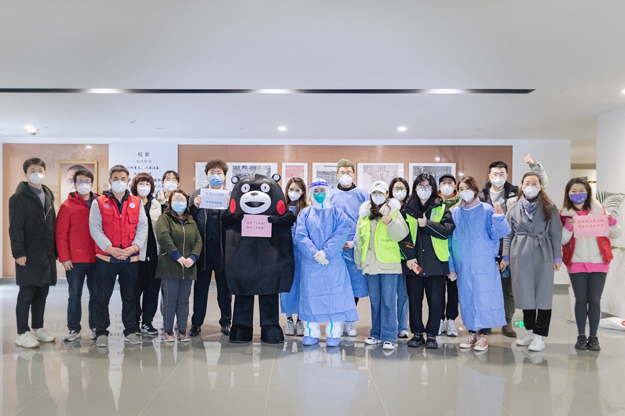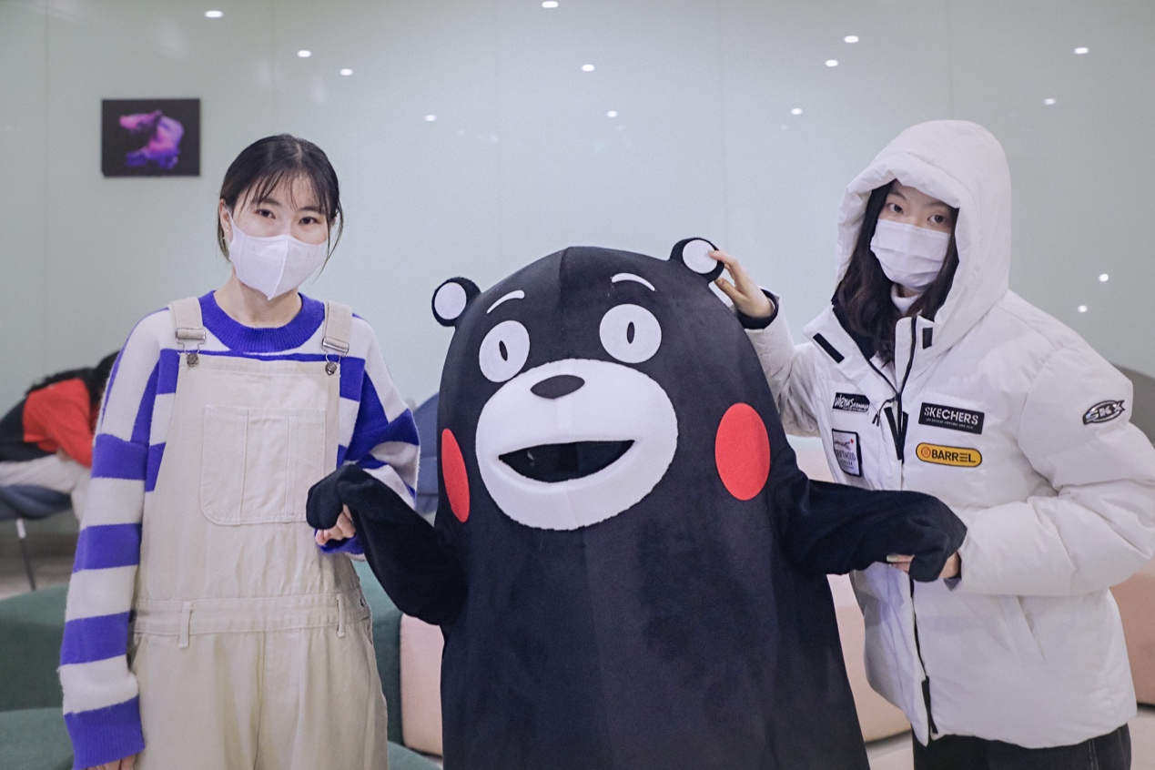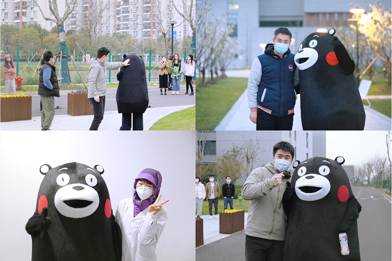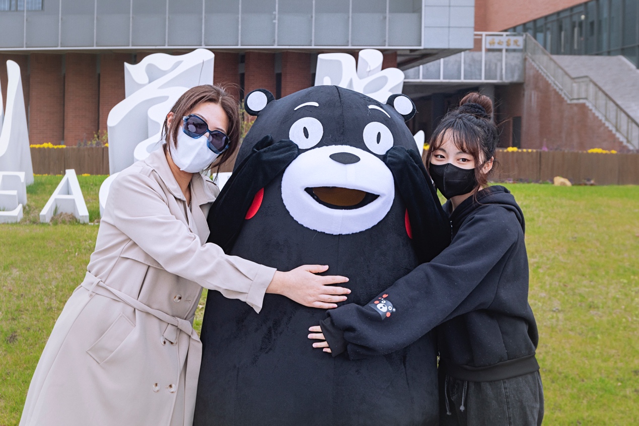 熊本熊由动画专业同学轮替扮演,熊孩子的一举一动都萌翻了大家,吸引了同学们和在校园值班的老师纷纷前来留影。在特殊时期,这样一份快乐更显得尤为宝贵。