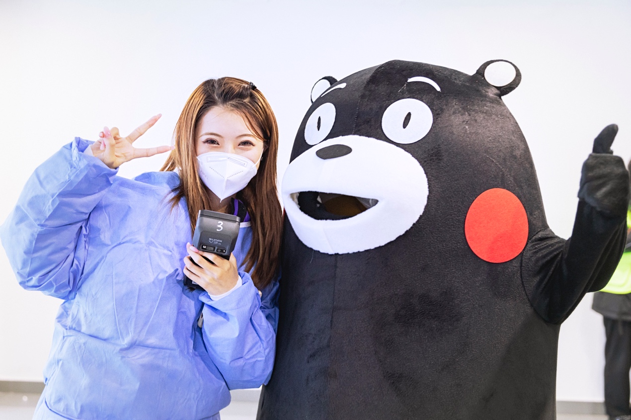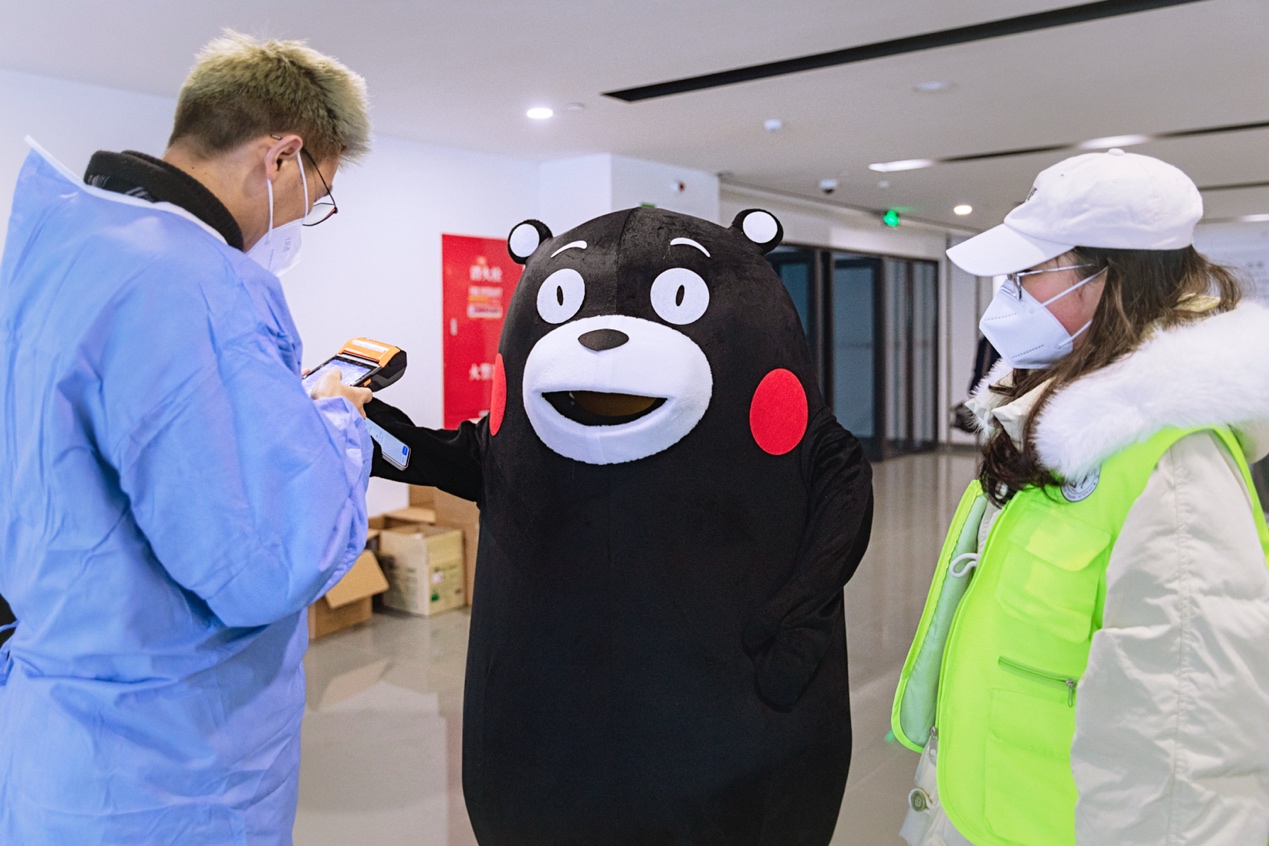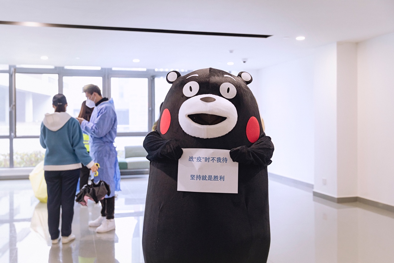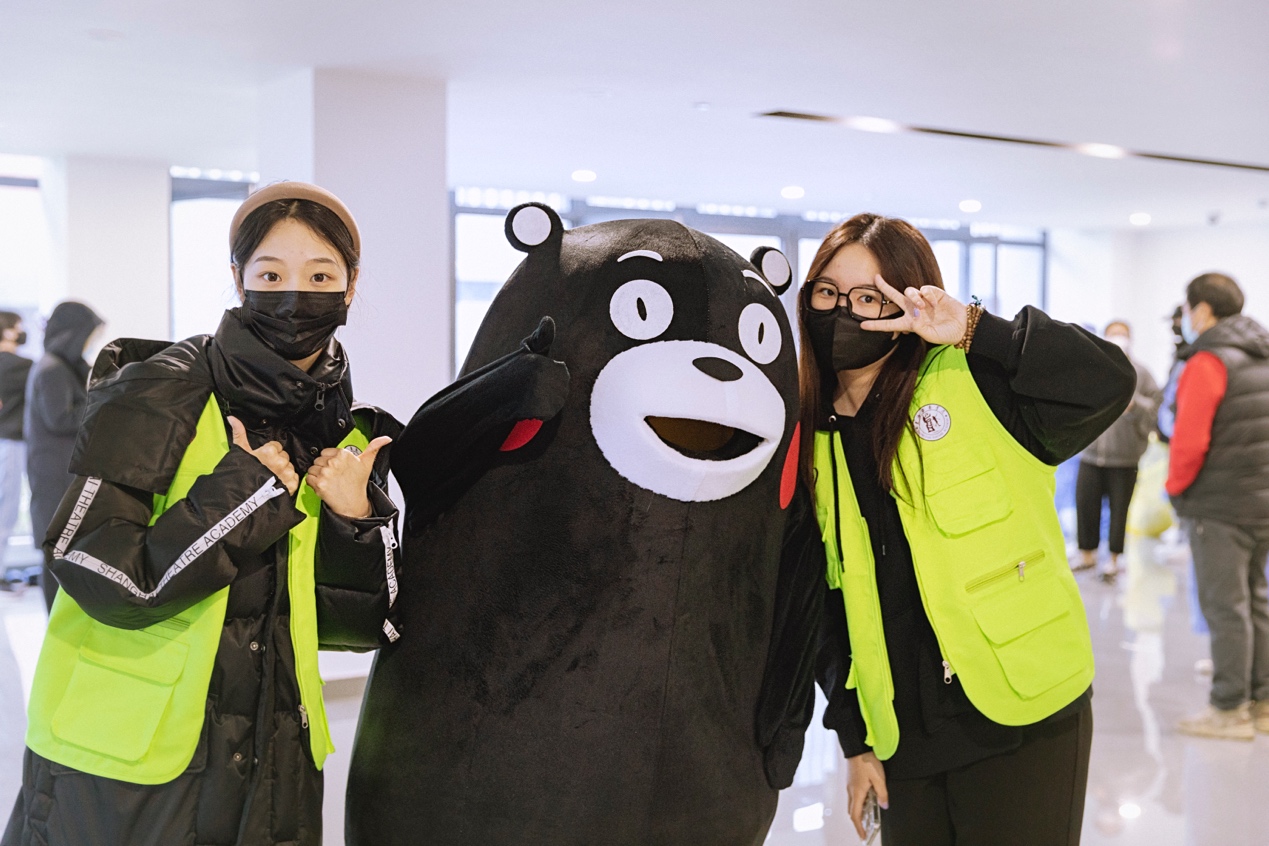 熊本熊由动画专业同学轮替扮演,熊孩子的一举一动都萌翻了大家,吸引了同学们和在校园值班的老师纷纷前来留影。在特殊时期,这样一份快乐更显得尤为宝贵。