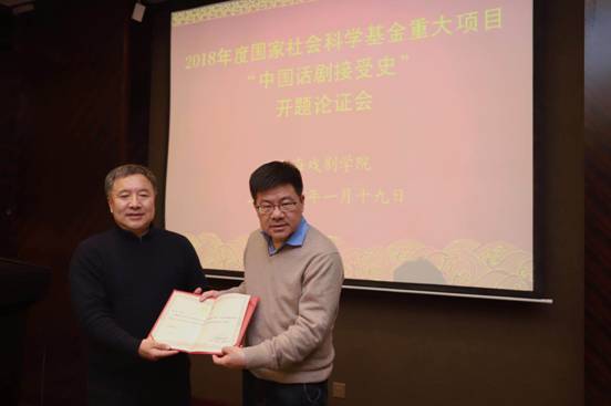 1月19日下午,2018年度国家社会科学基金重大项目“中国话剧接受史”开题论证会在上海举行。该项目由上海戏剧学院陈军教授担任首席专家,子课题负责人来自北京、上海和浙江三地。参与此次开题论证会的有:中国作家协会党组成员、书记处书记吴义勤,云南省政协科教文卫体委员会副主任吴卫民,中国艺术研究院话剧研究所所长宋宝珍,上海市哲学社会科学规划办主任李安方,上海戏剧学院院长黄昌勇,上海戏剧学院副院长杨扬,上海戏剧学院副院长刘庆,上海戏剧学院科研处处长吴爱丽、副处长支运波等领导。7位来自全国各地的评议专家,分别是南京大学资深教授、中国现代文学学会会长丁帆教授,中国作家协会书记处书记、中国当代文学研究会副会长吴义勤教授,中国舞台美术学会名誉会长、中国艺术研究院蔡体良研究员,复旦大学电影艺术研究中心主任、中国长三角高校影视戏剧学会会长周斌教授,南京大学文学院戏剧影视艺术系马俊山教授,云南省政协科教文卫体委员会副主任、云南艺术学院吴卫民教授,华东师范大学中文系副主任文贵良教授。5位子课题负责人,包括浙江大学胡志毅教授、上海戏剧学院杨扬教授、上海戏剧学院丁罗男教授、上海戏剧学院韩生教授、中国艺术研究院宋宝珍研究员。出席本次论证会的还有4位特邀嘉宾,他们分别是上海戏剧学院叶长海教授、刘庆教授、张福海教授和汤逸佩教授。此外,近20位上海戏剧学院教师、研究生及校外学者列席旁听。
