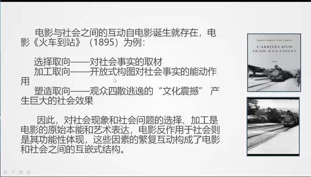 讲座包含两大内容:电影与社会研究的理论源流与理论框架。在理论源流部分,孟君教授通过梳理电影与社会研究的学术脉络,对艺术社会学和电影社会学的历史发展、研究重心及研究思路做出了详细的阐释,并表明电影社会学目前仍处于需进一步思考和系统化构建的状态,如何实现电影在审美功能和社会功能双重层面上的并重,是电影社会学待解决的问题。在理论框架部分,孟君教授提出“电影与社会的互嵌式结构”观点,认为电影和社会的关系不是局部的相互作用,而是一个完整的功能性文化系统,“电影对素材的选择取向”、“电影对素材的加工取向”和“电影对社会的塑造取向”三个层面共同构建了其封闭式互嵌结构。接着,孟君教授以大量具体的研究文本展开讲解:通过打捞中国电影中关于“1997”的社会时间,汲取出电影对社会变迁的选择取向;以青春片导演们的集体“怀旧症候”,剖析创作主体的加工取向;分析近年来病患题材电影所发挥的社会影响,点明电影推动甚至改变社会现实的塑造取向。最终,孟君教授指出,互嵌式结构是理解电影和社会之间具有普遍性的“复杂的统一性和互补性”的一种可行的视角和方法。