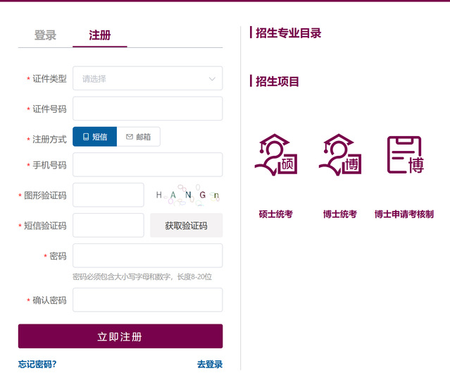 注册完成后,可根据本人报考类别,在页面右侧,选择“博士统考”或“博士申请考核制”登录。