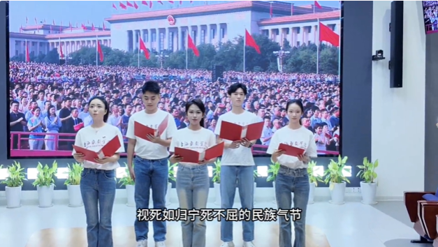 电影学院播音主持专业的学生们在收看教室里,献上了以铭记历史、缅怀先烈、珍爱和平、开创未来为主题的诗朗诵《我们为什么要铭记》。