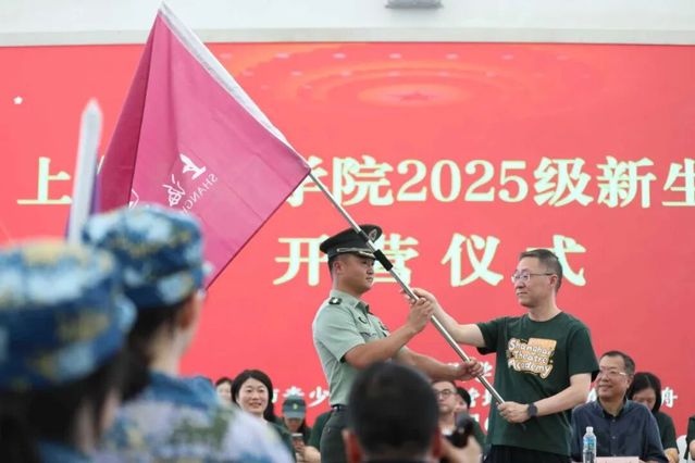 上海戏剧学院党委书记谢巍,向东方绿舟承训总教官授旗。随后,东方绿舟军训教官带领全体参训学员进行了庄严的宣誓。