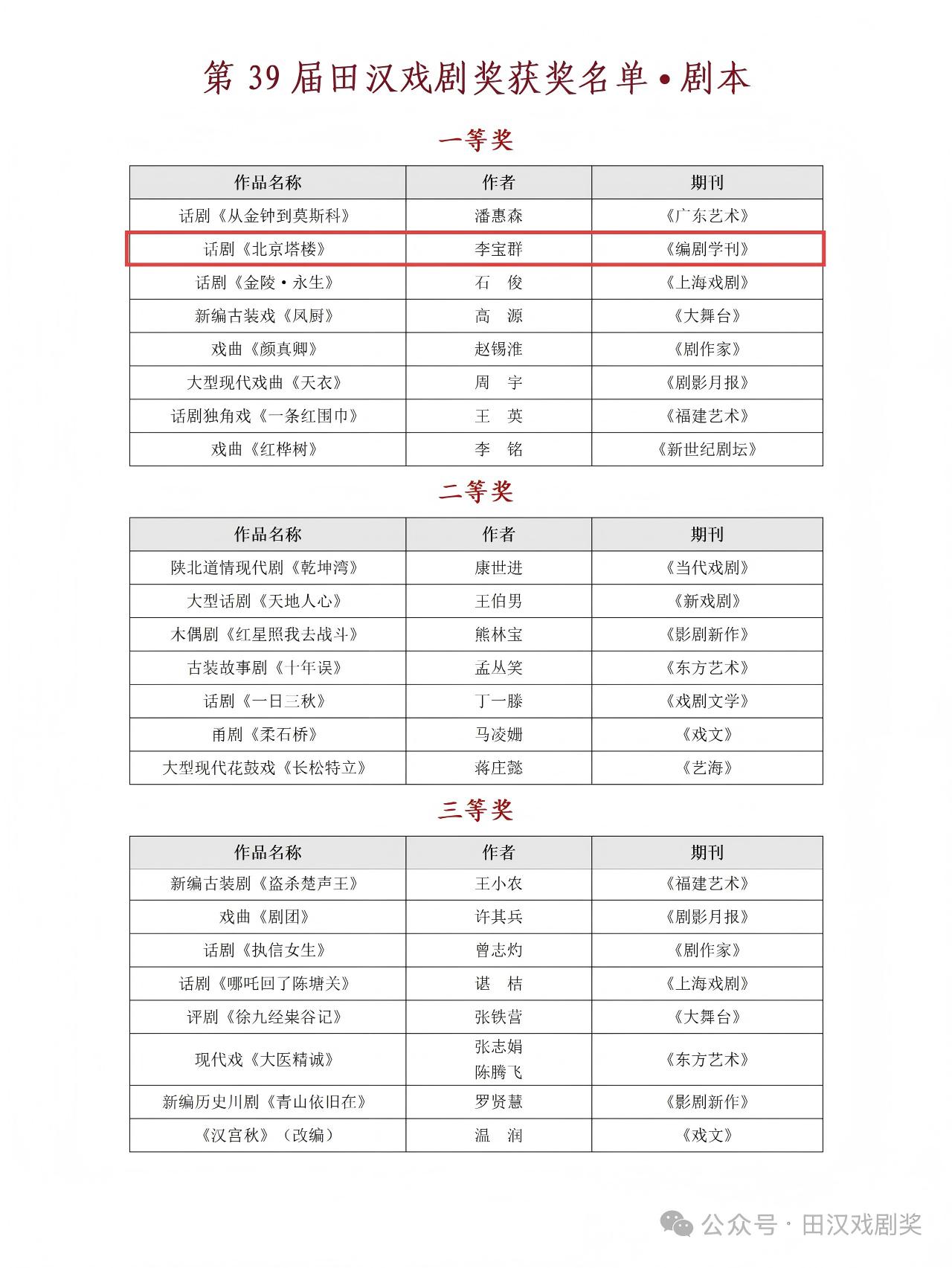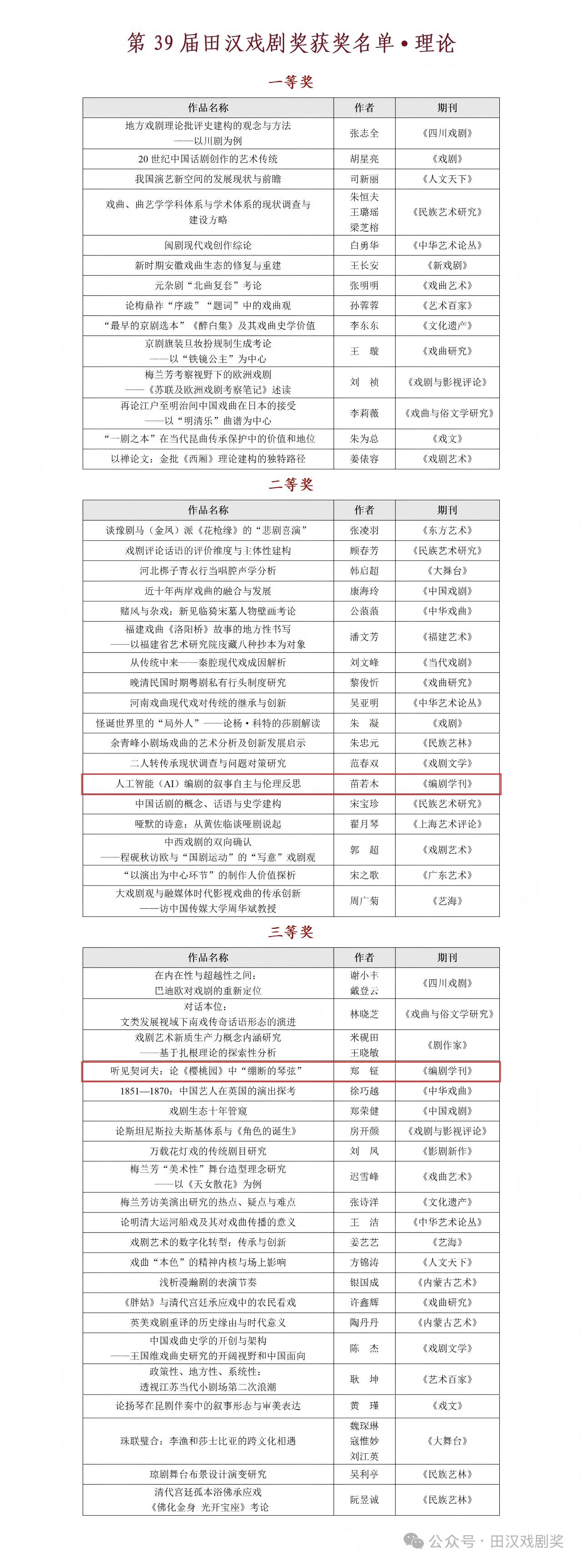 《编剧学刊》创办人、主编,戏文系陆军教授出席参评活动,本辑轮值主编、上海戏剧学院教务处副处长(主持工作)李世涛副教授代表学刊介绍报送的2部作品、3篇文章。最终,2部作品和3篇文章均斩获佳绩:话剧《嵇康之死》(编剧:肖留,导演:伊天夫,演出单位:上海戏剧学院)获得唯一优秀剧目奖,话剧《北京塔楼》(编剧:李宝群)获得剧本类一等奖。《如何让两个小时的独角戏变得更好看——以伦敦西区话剧<初步举证>为例》(作者:张欣桐)获得评论类一等奖,《人工智能(AI)编剧的叙事自主与伦理反思》(作者:苗若木)获得理论类二等奖,《听见契诃夫:论<樱桃园>中“绷断的琴弦”》(作者:郑钲)获得理论类三等奖。