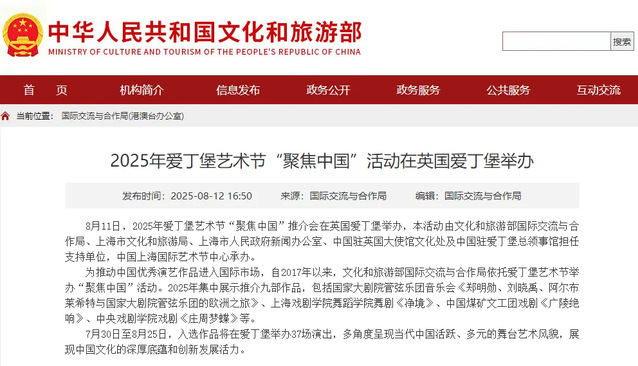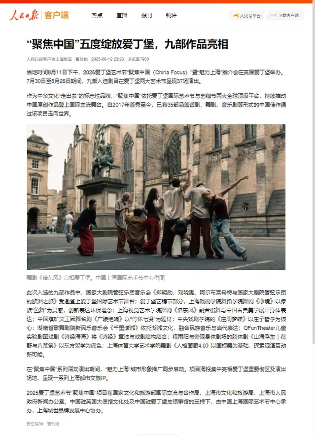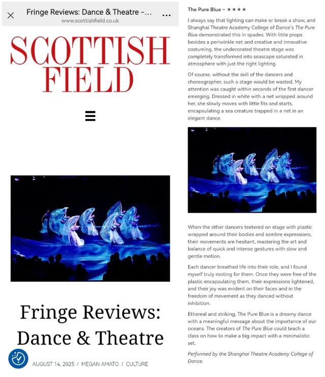 原创舞剧《净境》参加爱丁堡艺术节,是上戏代表团此次赴英的重要目的。《净境》由上戏舞蹈学院副院长周蓓编剧兼导演,获得上海文化发展基金会和上海国际舞蹈中心基金会支持,经中国上海国际艺术节遴选推荐,进入爱丁堡艺术节“聚焦中国”正单元。作品呼应艺术节Dare to Discover(敢于探索)的主题,在英期间完成三场剧场演出及四场快闪路演,观众反响热烈。国务院新闻办公室、文化和旅游部官网、人民日报、新华社国际频道、新华网、东方卫视、凤凰卫视等主流媒体报道中均对《净境》给予热情评价,英国主流媒体也将其评为四星节目。