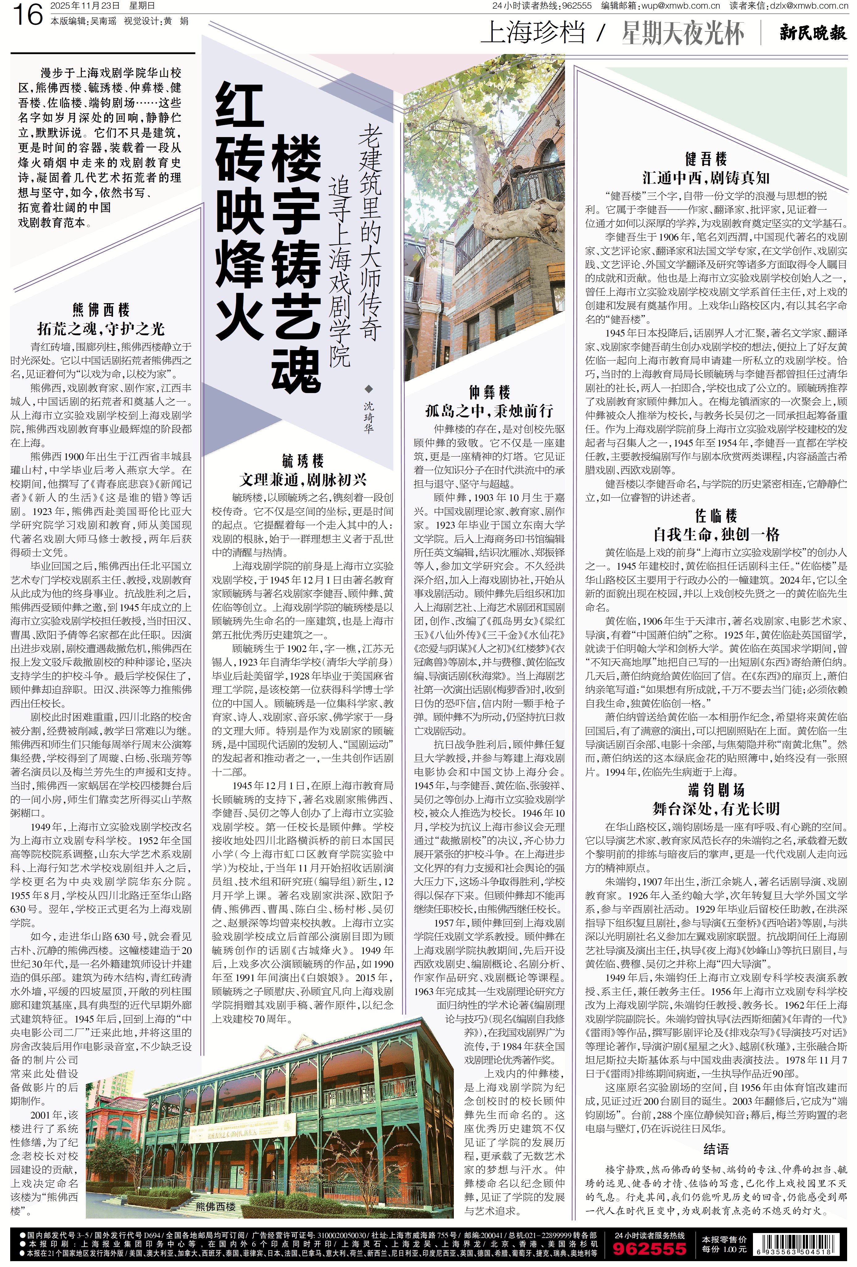 在上海戏剧学院建校80周年之际,各大媒体陆续推出一批相关报道,全面展现上戏的历史积淀和时代风貌。11月23日,《新民晚报》的“上海珍档/星期天夜光杯”栏目推出整版《红楼映烽火 楼宇铸艺魂》(作者:沈琦华),详细介绍了上戏老建筑里的大师传奇。