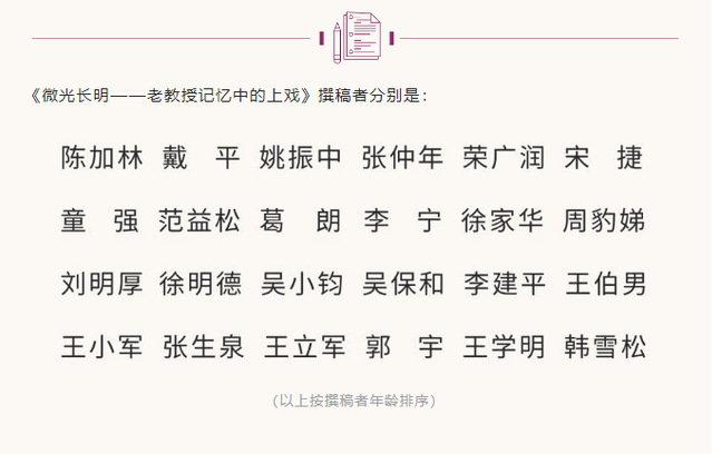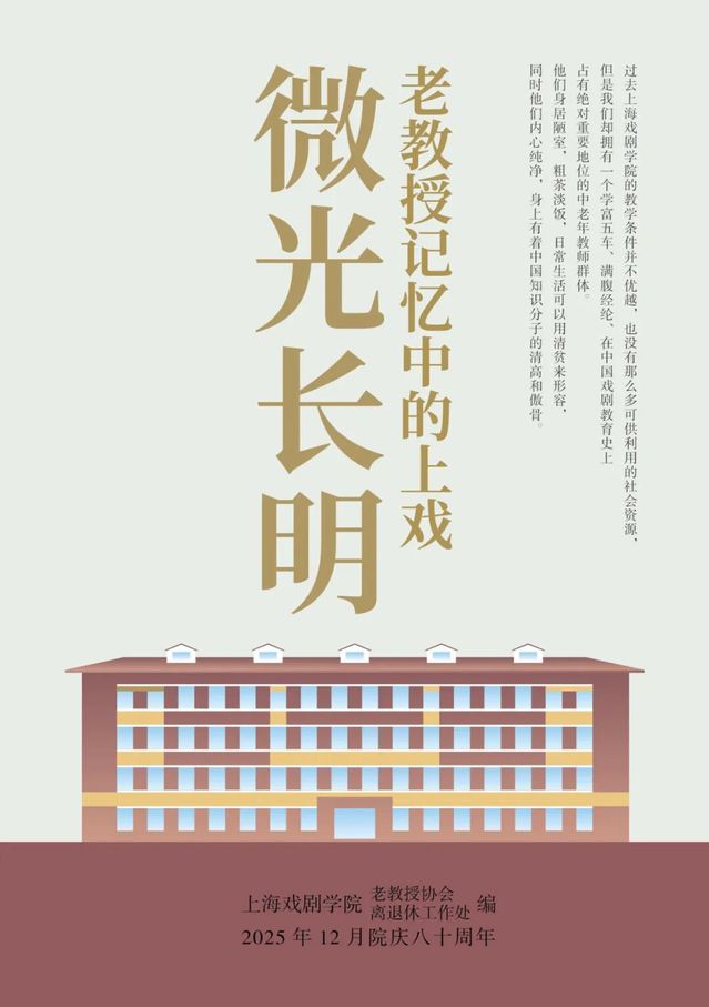 在上海戏剧学院建校八十周年的日子临近之际,上戏老教授协会与离退休工作处携手,编写了一本名为《微光长明——老教授记忆中的上戏》的文集,献给即将成为“80后”的上海戏剧学院。