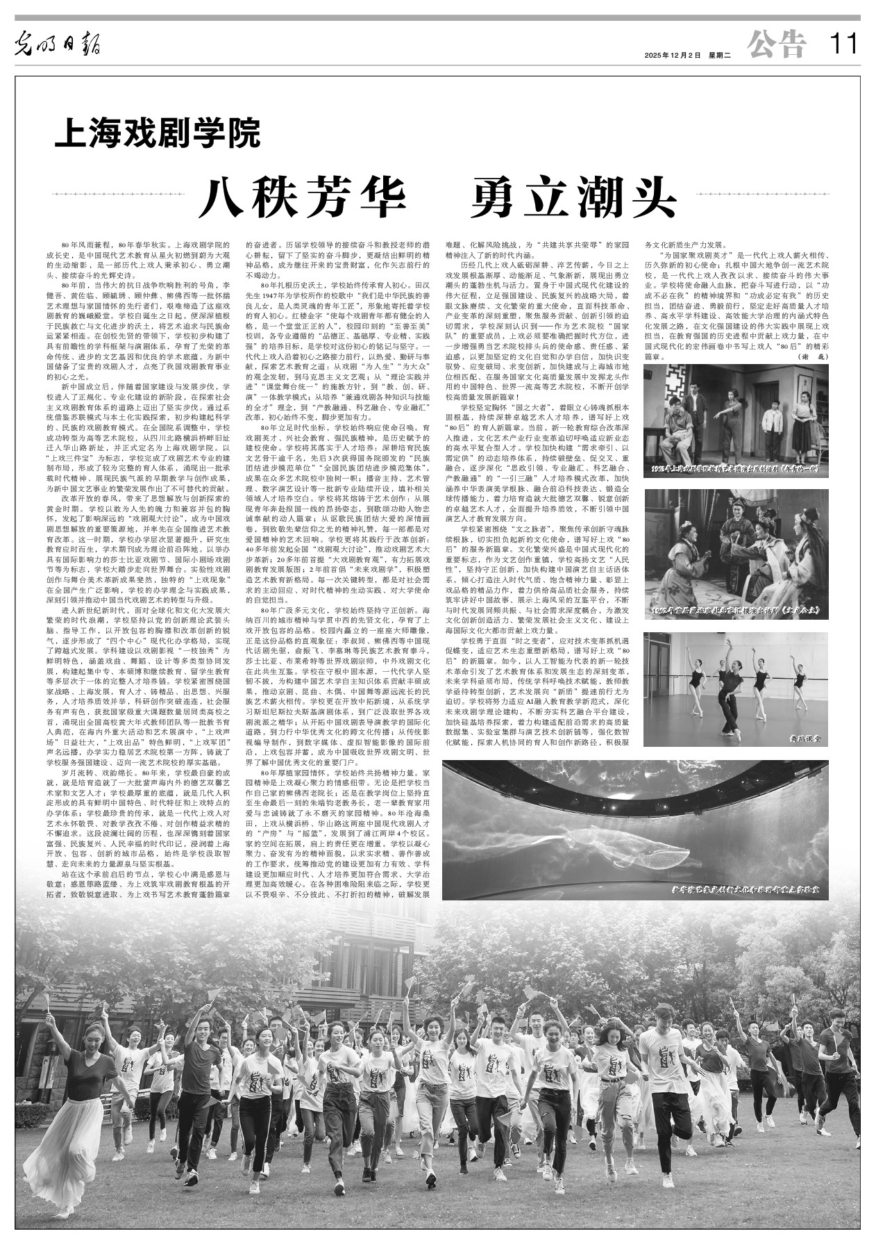 “为国家聚戏剧英才”是一代代上戏人薪火相传、历久弥新的初心使命;扎根中国大地争创一流艺术院校,是一代代上戏人孜孜以求、接续奋斗的伟大事业。学校将使命融入血脉,把奋斗写进行动,以“功成不必在我”的精神境界和“功成必定有我”的历史担当,团结奋进、勇毅前行,坚定走好高质量人才培养、高水平学科建设、高效能大学治理的内涵式特色化发展之路,在文化强国建设的伟大实践中展现上戏担当,在教育强国的历史进程中贡献上戏力量,在中国式现代化的宏伟画卷中书写上戏人“80后”的精彩篇章。(谢巍)