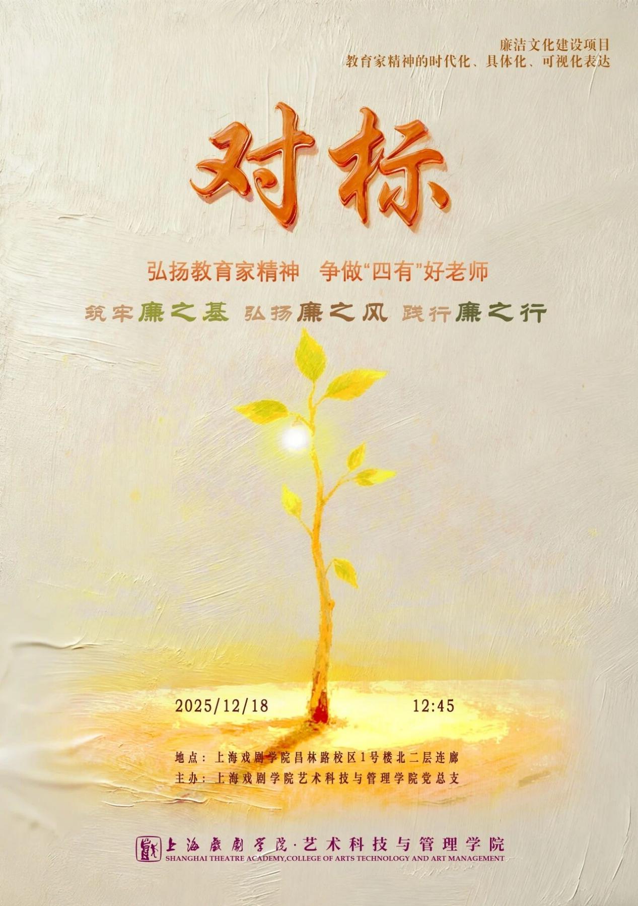 为深入弘扬教育家精神,推动廉洁文化与教育教学深度融合,12月18日,上海戏剧学院艺术科技与管理学院党总支在昌林路校区1号楼北二层连廊,成功举办“对标——弘扬教育家精神,争做‘四有’好老师”廉洁文化建设成果展暨主题党日活动。