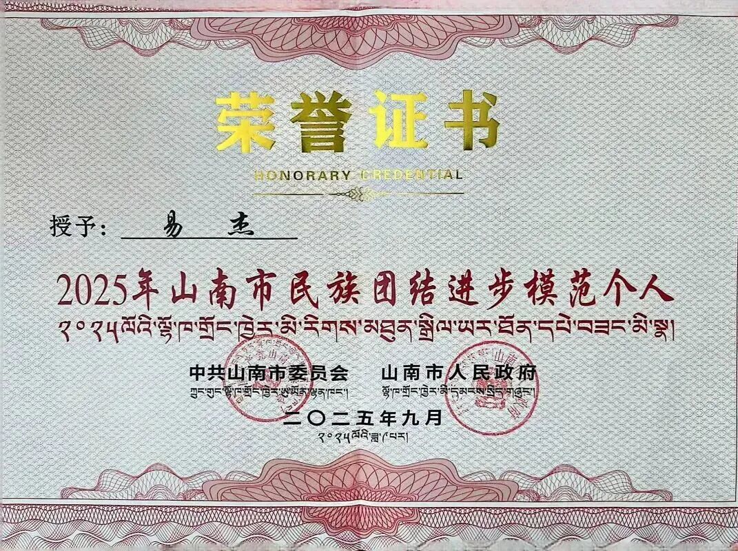 近期,易杰老师光荣获得了2025年山南市“民族团结进步模范个人”荣誉
