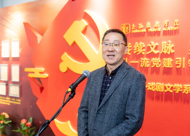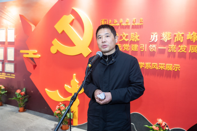 戏剧文学系的展示以“一流党建引领一流发展”为主题,全面呈现该系近年来在党建、教学、创作、科研、人才培养等方面取得的成果。开幕式由系主任陈军主持,他表示,戏剧文学系是上戏最早成立的系科之一。在校党委的坚强领导下,近年来全系党政工作坚持以“赓续文脉、守正创新”为基本出发点,以党建引领和推进各项工作的蓬勃发展。
