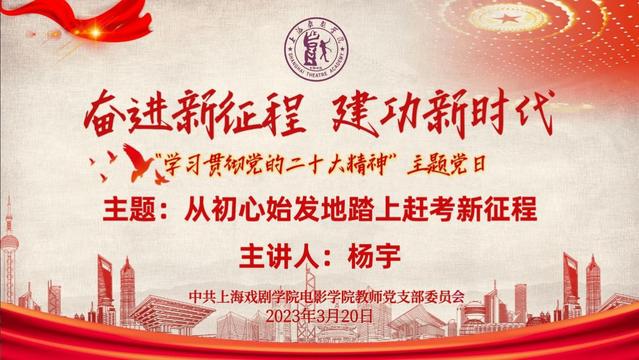 为进一步深入学习贯彻党的二十大精神,加强党史学习教育与专业建设相结合,2023年3月20日,上海戏剧学院电影学院教师党支部举行“学习贯彻党的二十大精神”主题党日活动,邀请中国共产党第二十次全国代表大会代表、中共一大纪念馆宣传教育部主任杨宇同志,为支部党员和部分学生党员、积极分子作主题为《从初心始发地踏上赶考新征程》的专题讲座。