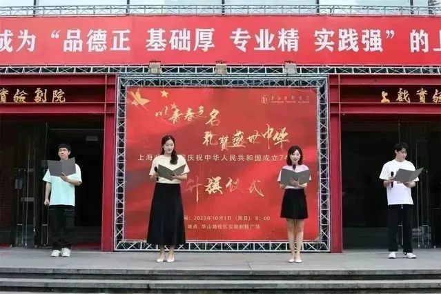 上午8时,上海戏剧学院师生齐聚于华山路校区,举行“以青春之名,礼赞盛世中华”国庆升旗仪式。