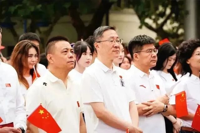 阳光下晨风中,热法提、潘浩卿、王子智善、马星宇等四位2023级新生以升旗手的身份,迈着铿锵有力的步伐护送国旗走向旗杆。在全场高唱的国歌声中,五星红旗徐徐升起,骄傲地迎风飘扬。现场所有人向国旗行庄严的注目礼,自豪感油然而生。