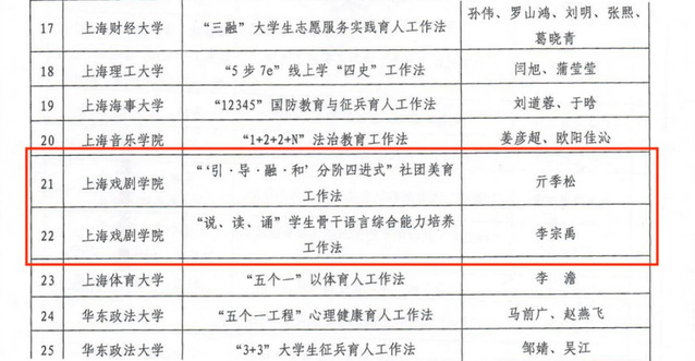 亓季松老师总结撰写的《“‘引·导·融 ·和’分阶四进式”社团美育工作法》,李宗禹老师总结撰写的《“说、读、诵” 学生骨干语言综合能力培养工作法》入选2022年上海高校辅导员特色工作法。