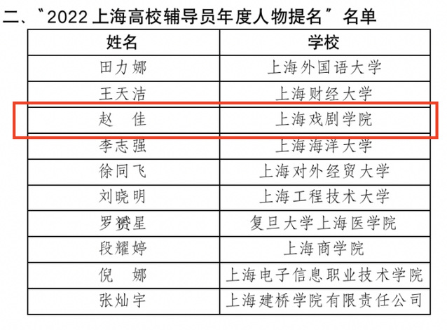 在“2022上海高校辅导员年度人物”宣传展示活动中,舞蹈学院专职辅导员赵佳老师经我校推荐、网络投票、专家复审、终审答辩、公示等环节,喜获2022上海高校辅导员年度人物提名奖。