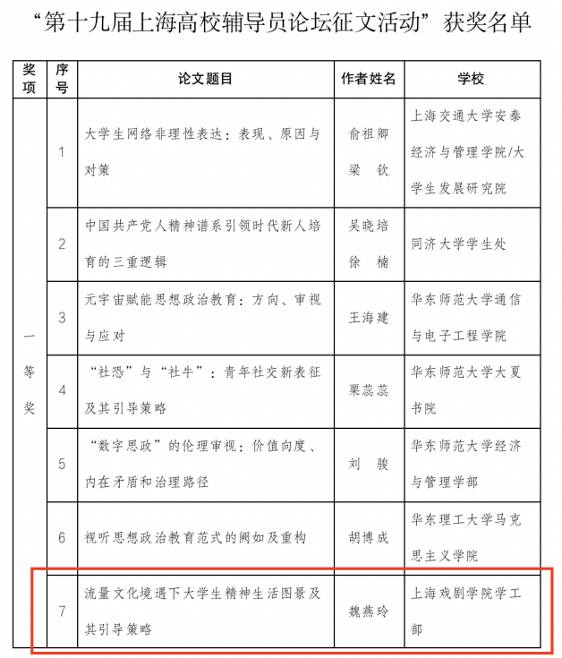 在“第十九届上海高校辅导员论坛征文活动”中,学工部魏燕玲老师的论文《流量文化境遇下大学生精神生活图景及其引导策略》荣获一等奖。