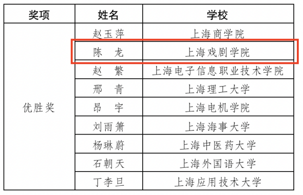 在“2022年上海高校辅导员素质能力大赛”中,经案例分析、理论宣讲展示等环节,戏剧文学系专职辅导员刘莹莹老师荣获二等奖,创意学院专职辅导员陈龙老师荣获优胜奖。