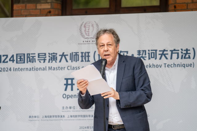 国际剧协总干事托比亚斯先生致辞。他表示,很高兴上海戏剧学院青年戏剧创作者能够得到俄罗斯杰出教育家的支持与技巧传授,将契诃夫表演技巧带到中国,这一举措为上海戏剧学院的师生和其他的艺术家提供了一条新途径,以提升其舞台表演能力。这不仅是为了舞台艺术家的个人成长,也将为观众带来更丰富的剧场体验,并有助于拓宽戏剧作品的受众基础。托比亚斯先生进一步指出,通过此次大师班,教授与学习新技能的互动将为中俄双方创造一个充满启发和成果的交流经历。他期待这种合作能够促进两国在戏剧教育和艺术实践方面的共同进步,并为参与者带来深远的影响。最后,他祝愿所有参与者在此次大师班中都能获得宝贵的经验,实现个人与专业上的成长。