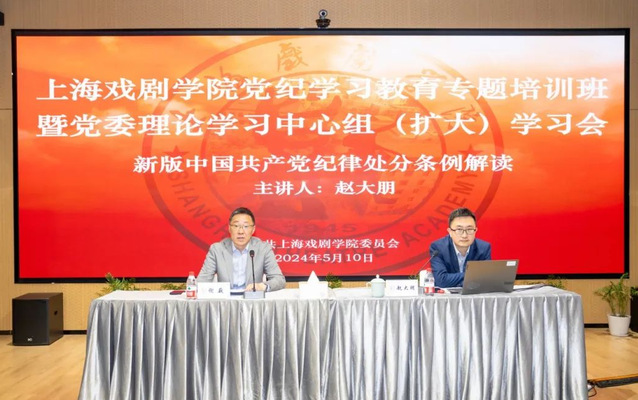 为深入开展党纪学习教育,进一步强化全校党员干部的纪律意识,上海戏剧学院党纪学习教育专题培训班暨党委理论学习中心组(扩大)学习会于5月10日举行。校领导,中层干部,各基层党组织书记、副书记,党纪学习教育工作专班成员参加专题培训班学习。
