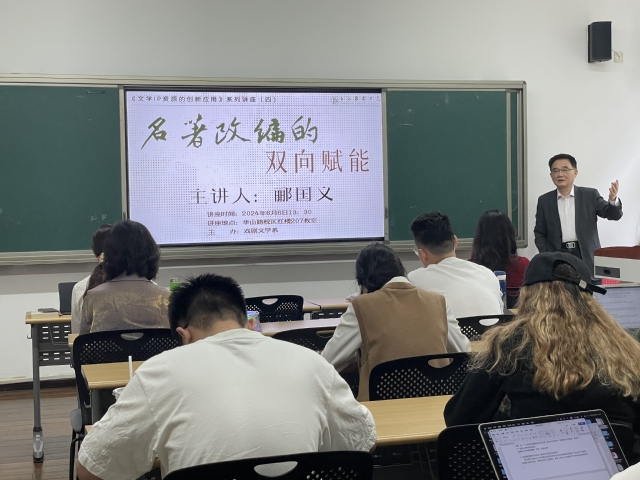 华山路校区红楼207教室于2024年6月6日下午沉浸在浓厚的学术氛围中,这里正在举行由戏剧文学系主办的“文学IP资源的创新应用”系列讲座第四场。本次讲座特邀著名文艺评论家、高级编辑、郦国义教授作为主讲嘉宾,为大家带来一场主题为《名著改编的双向赋能》的精彩演讲。