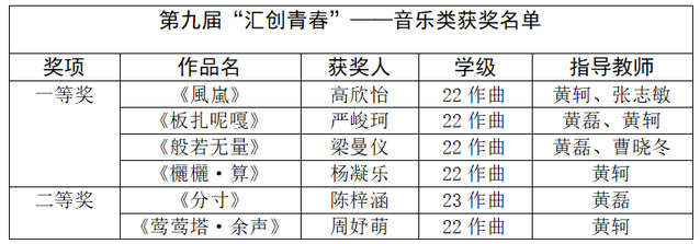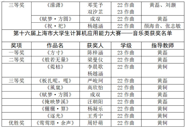 在刚刚公布的2024年第九届汇创青春(音乐艺术类)与第十六届上海市大学生计算机应用能力大赛获奖名单中,电影作曲系学生和教师团队指导的参赛作品共获得18项奖项的好成绩,其中汇创青春一等奖4项、二等奖2项、三等奖3项;计算机应用能力大赛一等奖1项(排名第一)、二等奖2项、三等奖6项、优胜奖1项,可喜可贺!获奖作品受到了相关专业领域和社会的广泛关注与好评。